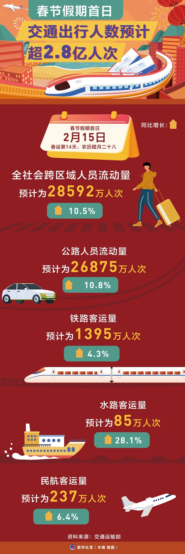 摘要:記者2月15日從交通運輸部獲悉,春節(jié)假期首日(2月15日,春運第14天,農(nóng)歷臘月二十八)預計全社會跨區(qū)域人員流動量為28592萬人次,比2025年同期增長10.5%。