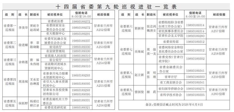 據(jù)悉,省委各巡視組將在被巡視部門單位工作2個半月左右,巡視期間設(shè)立專門值班電話和郵政信箱,主要受理反映被巡視黨組織領(lǐng)導(dǎo)班子及其成員、下一級黨組織主要負(fù)責(zé)人和重點崗位人員問題的來信來電來訪,重點是關(guān)于違反政治紀(jì)律、組織紀(jì)律、廉潔紀(jì)律、群眾紀(jì)律、工作紀(jì)律、生活紀(jì)律等方面的舉報和反映。巡視組受理信訪時間截止到2026年6月9日。(記者金鑫)